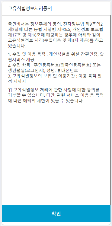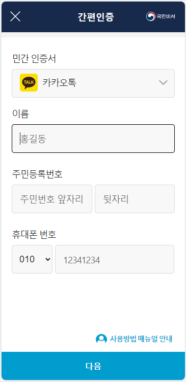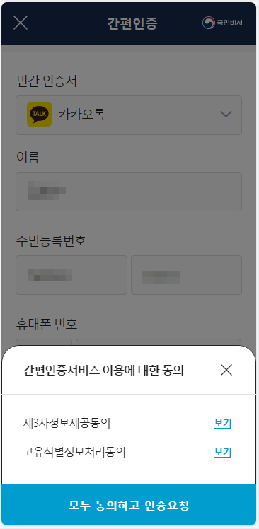 - ๊ฐ์ธํต๊ด๊ณ ์ ๋ถํธ ๋์ฉ์ ๊ณ ๋ ์ฑ๋ช , ์ฃผ๋ฏผ๋ฑ๋ก๋ฒํธ ์ ๋ ฅ ํ ํด๋ํฐ/๊ฐํธ์ธ์ฆ์ ํ์ ์ผ ํฉ๋๋ค.