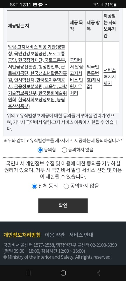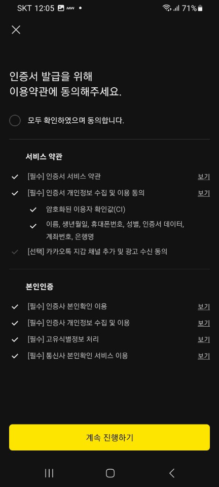 3. ๊ฐํธ์ธ์ฆ์๋น์ค ์ด์ฉ์ ๋ํ ๋์ ๋ด์ฉ์ 2๊ฐ ๋ค ํ์ธํ ํ ๋ชจ๋ ๋์ํ๊ณ ์ธ์ฆ์์ฒญ์ ํด๋ฆญํฉ๋๋ค.