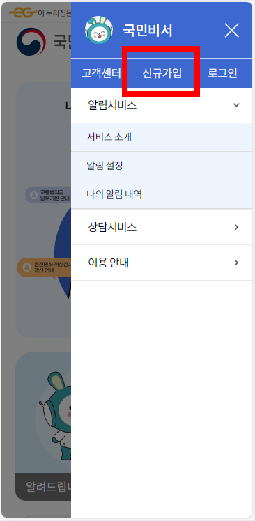 1. ๊ตญ๋ฏผ๋น์ ์๋ฆผ ์ฌ์ดํธ์์ ์ฐ์ธก ์๋จ์ ์๋ ๋ฉ๋ด๋ฒํผ์ผ๋ก ๋ค์ด๊ฐ์ ์ ๊ท๊ฐ์ ์ ํด๋ฆญํฉ๋๋ค.