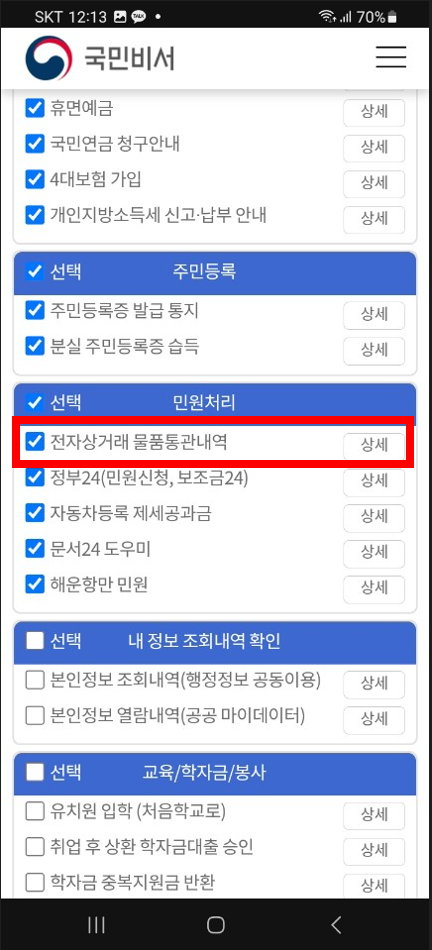 8. ๋ด๊ฐ ๋ฐ์๋ณด๊ณ ์ถ์ ์ ๋ณด์ ์ฒดํฌ๋ฅผ ํฉ๋๋ค. ๋์ ํด์ธ์ง๊ตฌ ํต๊ด์ํฉ์ ๋ฐ์๋ณด๋ ค๋ฉด ๋ฏผ์์ฒ๋ฆฌ์์ "์ ์์๊ฑฐ๋ฆฌ ๋ฌผํํต๊ด๋ด์ญ"์ ์ฒดํฌํฉ๋๋ค. ๊ทธ๋ฆฌ๊ณ ์ ์ฒญํ๊ณ ์๋ฃํฉ๋๋ค.